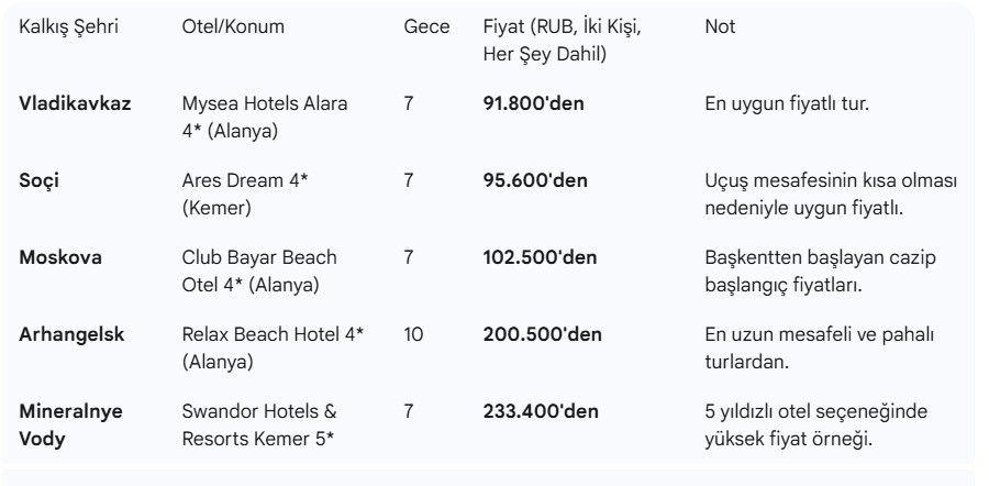 Rusya'nın önde gelen tur operatörleri, 2026 yaz sezonu için Türkiye charter turlarında erken rezervasyon dönemini başlattı. Yapılan piyasa analizlerine göre, uçak bileti ve her şey dahil konaklama imkanı sunan iki kişilik Türkiye paketlerinin fiyatları, şu anda sadece 92.000 Rus rublesinden (RUB) başlıyor. Bu cazip fiyatlar, %50'ye varan tasarruf imkânı sağlıyor.Tur operatörleri (PEGAS Touristik, Coral Travel, Anex, FUN&SUN ve Intourist), Rus vatandaşlarını kış mevsimi gelmeden yaz tatillerini güvence altına almaya çağırıyor.