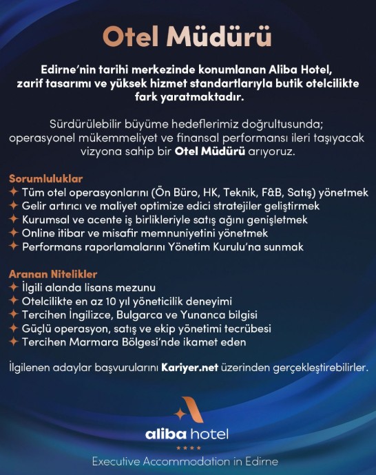 Edirne’nin tarihi merkezinde konumlanan Aliba Hotel, otel müdürü pozisyonu için yeni bir yönetici aradığını duyurdu. Butik otel konseptiyle hizmet veren tesis, zarif tasarımı ve yüksek hizmet standartlarıyla misafirlerine konaklama deneyimi sunuyor.