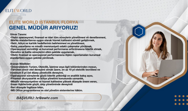 Elite World İstanbul Florya oteli için genel müdür ilanı verildi. İlgilenen adayların başvurularını, [email protected] e-posta adresi üzerinden iletmeleri istendi.