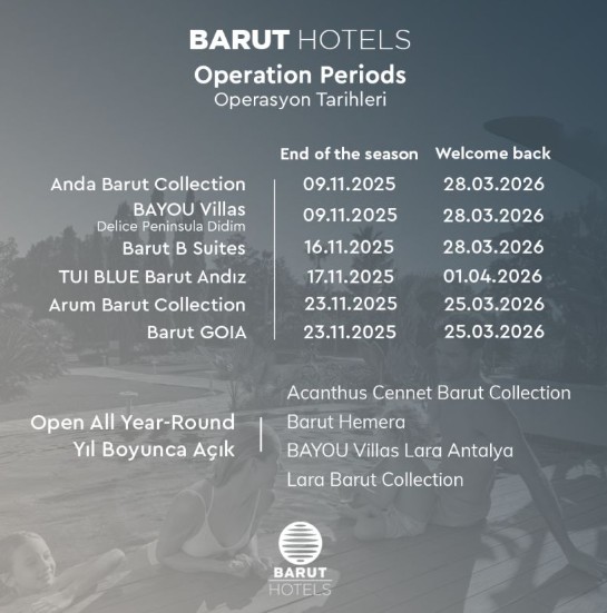 Antalya'nın en önemli yerli zincir otellerinden Barut Hotels hangi otellerinde sezonu kapatacağını hangilerinin yıl boyu açık kalacağını açıkladı. Barut Hotels'ten yapılan açıklamada " Bir sezonu daha unutulmaz anılarla geride bırakırken, yeni sezonda misafirlerimizi yeniden ağırlayacak olmanın heyecanını yaşıyoruz. Yıl boyunca hizmet veren otellerimizle, her mevsim Barut Hotels ayrıcalığını yaşatmaya devam ediyoruz." ifadelerine yer verildi.Barut Hotels'in sahibi olduğu 10 otelden 6'sı Kasım ayı içinde sezonu kapatacak. 4'ü ise yılboyu açık kalacak. Kasım'da sezonu kapatacak ve yılboyu açık kalacak oteller şöyle: