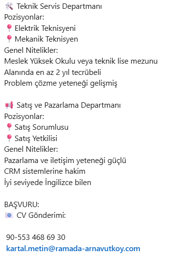 İstanbul Havalimanı bölgesinde yeni açılacak Ramada By Wyndham Arnavutköy'ün kadrosu oluşturuluyor. Otel için farklı departmanlarda takım arkadaşları aranıyor.Otel için aranan pozisyonlar şöyle: