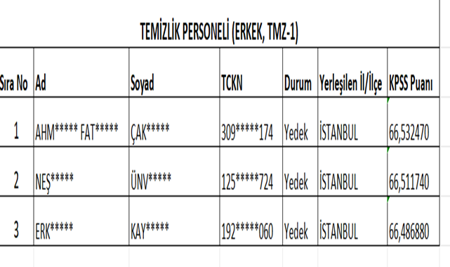 YERLEŞTİRİLEN YEDEK ADAYLARDAN İSTENEN BELGELER1-Dilekçe (Örneği için tıklayınız.)2-Öğrenim Belgesi aslı veya onaylı örneği, (e-Devlet üzerinden de alınabilir)3-Nüfus Cüzdanı aslı veya onaylı örneği, (e-Devlet üzerinden de alınabilir)4- KPSS sonuç belgesi (e-Devlet üzerinden alınacaktır)5-HeyetRaporu;a) Temizlik Personeli için; "Temizlik görevini devamlı yapmasına engel olabilecek hastalık ve benzeri engelleri bulunmadığını" gösteren Heyet Raporu (Tam teşekküllü Devlet veya Devlet Üniversitesi Hastanelerinden) almaları gerekmektedir.6-Mal Bildirimi (Örneği için tıklayınız.) (İki sayfa olan Mal Bildirimi arkalı önlü olarak tek yaprakta doldurulacaktır.)7-30.04.2024 tarihi veya sonrası itibariyle alınan Adli Sicil Belgesi (E-Devlet üzerinden de alınabilir), (Belgede adli sicil kaydı yoktur, adli sicil arşiv kaydı yoktur ibareleri beraber bulunmalı), (Vardır ibaresi bulunması halinde konuyla ilgili belgelerin gönderilmesi)8-Askerlik Belgesi (Erkekler için) (e-Devlet üzerinden alınacaktır) Askerlik hizmetini tamamlamış adayların Terhis Belgesi örneği.9-Yerleşim Yeri Belgesi (e-Devlet üzerinden alınacaktır)