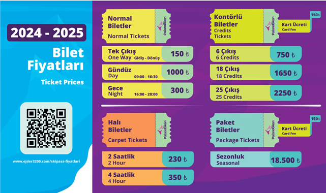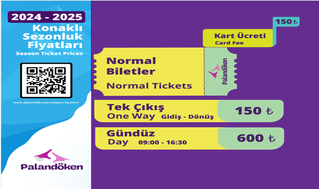 Palandöken Kayak Merkezi skipass ücretleri 2024-2025 sezonunda güncellendi. Buna göre geçtiğimiz kış sezonunda tek çıkış (gidiş-dönüş) 100 lirayken bu yıl yüzde 50 zamlanarak 150 liraya yükseltildi. Gündüz (09.00-16.30) 1000 lira, gece (1600.20.00) 300 lira olarak belirlendi. Palandöken Kayak Merkezi skipass ücretleriyle ilgili güncel tarife şöyle: