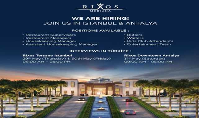 Suudi Arabistan Cidde'de yeni açılacak olan Rixos Hotels Murjana Cidde için yeni takım üyeleri aranıyor. Rixos Hotels Murjana Cidde'de çalışmak isteyenlerin 29 ve 30 Mayıs'ta Rixos Tersane İstanbul'da, 31 Mayıs'ta Rixos Antalya Şehir Merkezi'nde gerçekleştirilecek personel alım görüşmelerine katılmaları gerekiyor. Mülakat Yerleri:Rixos Tersane İstanbul